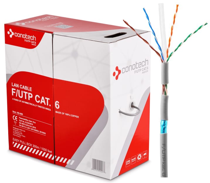 Wysokiej jakości kabel sieciowy, ekranowany F/UTP kat.6, składa się z czterech par przewodów skręconych asymetrycznie wykonanych z czystej miedzi, oddzielonych od siebie przy pomocy separatora krzyżowego. Jego zastosowanie powoduje zmniejszenie zakłóceń występujących pomiędzy parami żył. Natomiast do ich izolacji został użyty jednolity polietylen HDPE, który cechuje się podwyższoną gęstością oraz szczególnie wysoką izolacją dielektryczną. Skrętka komputerowa posiada aluminiowy ekran i stalowe, miedziowane uziemienie zwiększające niewrażliwość na elektromagnetyczne zakłócenia w transmisji sygnału. Powłoka wykonana jest z polwinitu PCV w kolorze szarym o średnicy zewnętrznej Ø6,30 ± 0,02 mm, która pełni funkcję ochronną przed uszkodzeniami mechanicznymi oraz umożliwia szybkie i trwałe prowadzenie kabla.