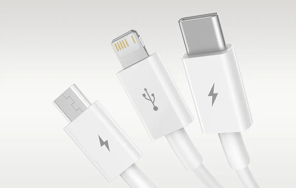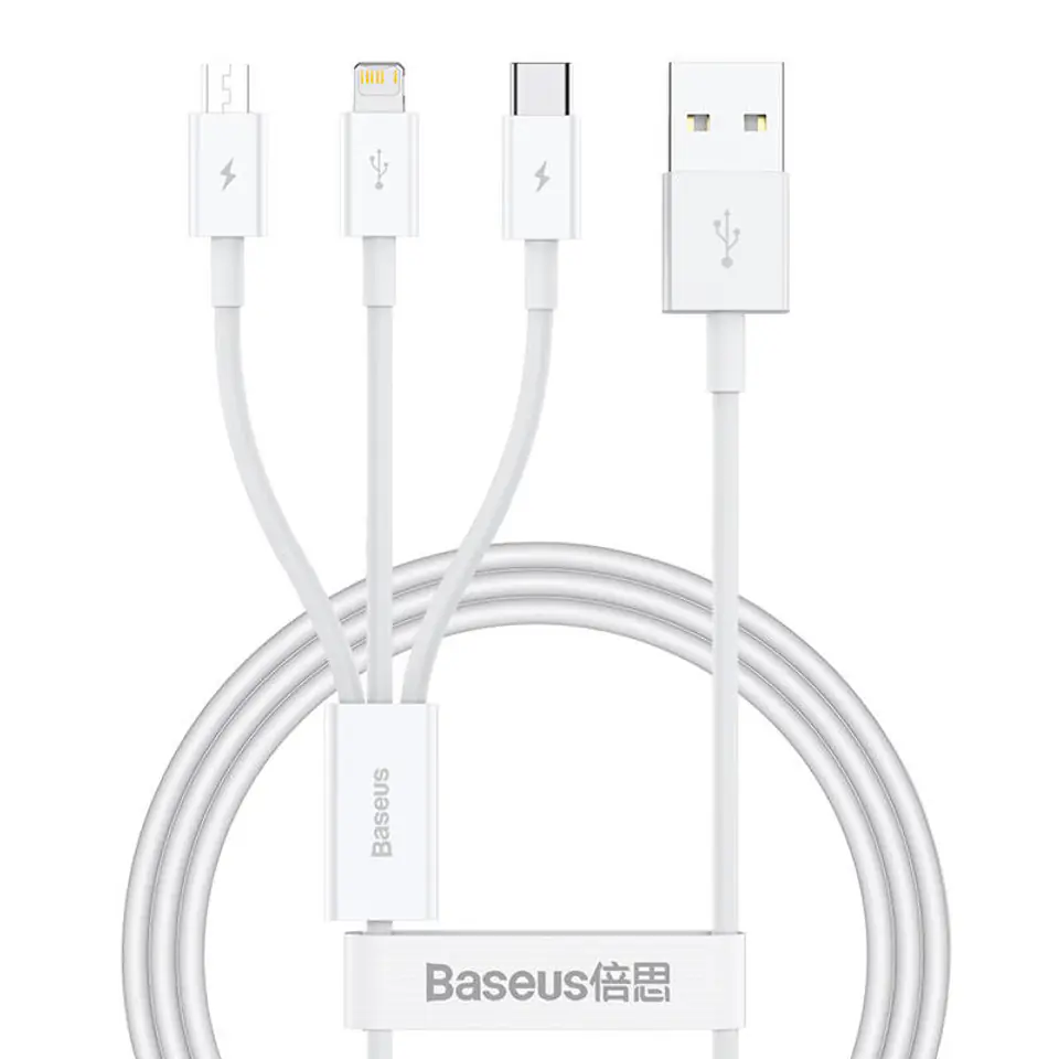 Producent Baseus Model P10320105221-00 Typ złącza USB-C, Lightning, Micro USB Długość kabla 1 m Kolor Biały Natężenie 3.5 A Prędkość transmisji 480 Mbps