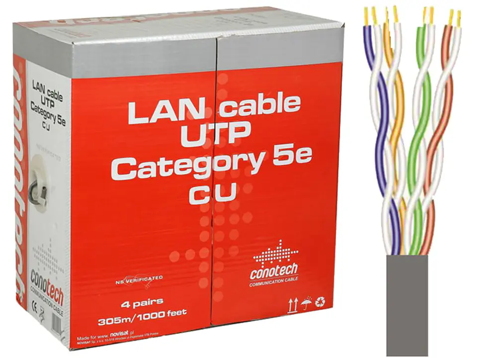 Rodzaj: U/UTP, kat.5e wykonany z czystej miedzi