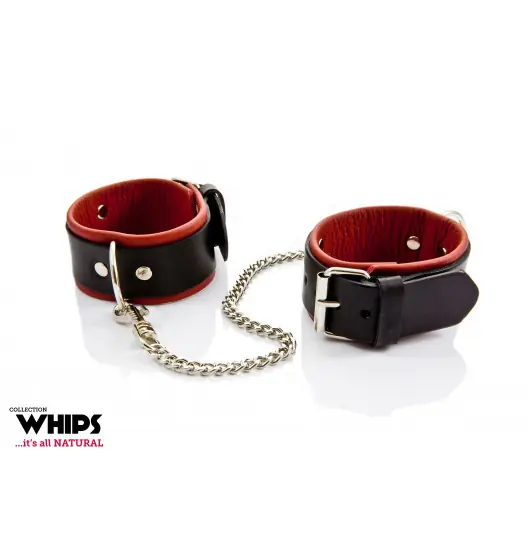 Skórzane kajdanki damskie na nogi w kolorze czarno - czerwonym zapinane na masywne klamry. Możliwość regulacji rozmiaru.