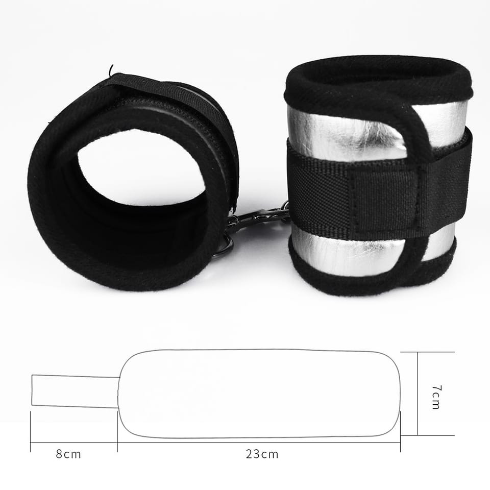 Poddaj się swojemu kochankowi, walcząc z miękkimi kajdankami, mocnymi i wygodnymi z paskami na rzepy i klipsami do łączenia ich ze sobą lub z innymi przedmiotami bondage z D-ringami Idealny jako wprowadzenie do krępowania i lekkiej gry bondage. Mocna, bezpieczna i ekscytująca zabawa w krępowanie jest do odkrycia dzięki tym kajdankom do bondage. Dzięki wyjątkowo miękkiej aksamitnej wyściółce i eleganckiej srebrnej neoprenowej obudowie są idealne do pierwszych zabaw w krępowanie.
