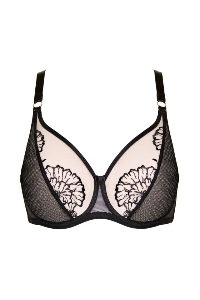 - Prześwitujące, wyciągnięte ku górze, miękkie miseczki z podwójnej siateczki i haftu,