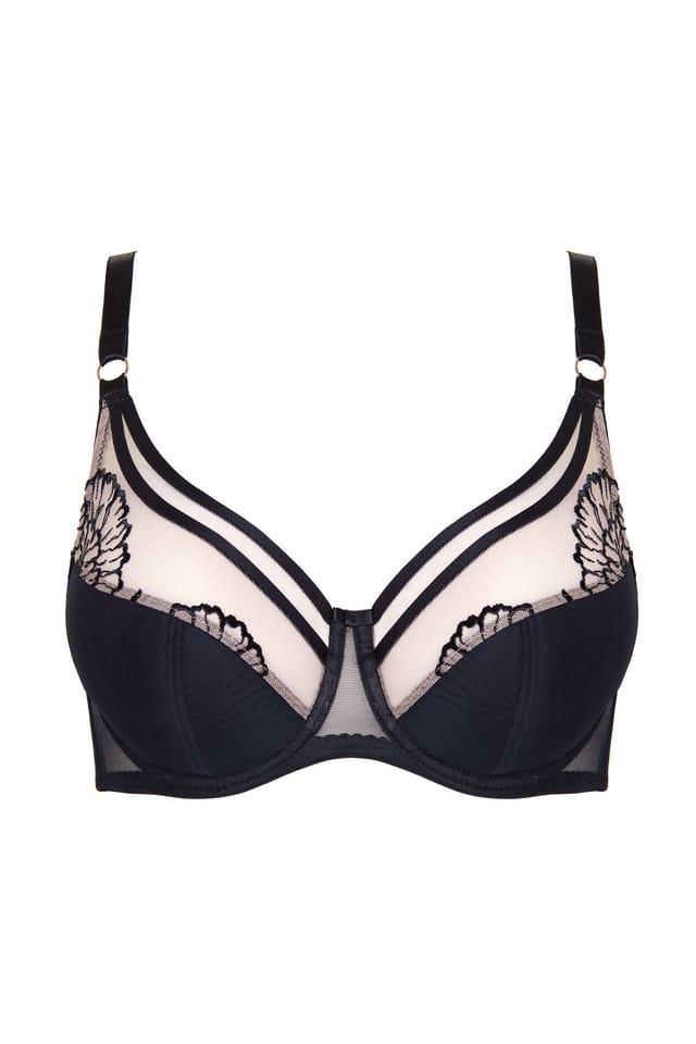 - Dolna część misek wykonana z cienkiej pianki gorseciarskiej powleczonej miękkim tiulem, a górna z siateczki ozdobionej haftem, dzięki czemu biustonosz doskonale dopasowuje się do kształtu piersi,