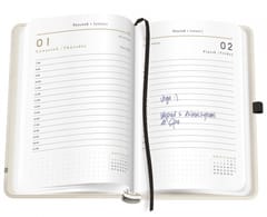 - Wyposażony w praktyczne dodatki: tasiemkę do zaznaczania strony i pętelkę na długopis