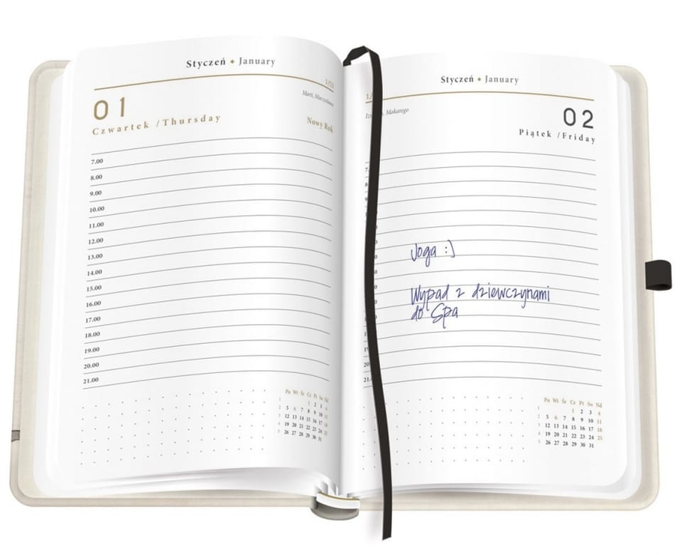 - Kalendarz w układzie dzień na stronie z podziałem na godziny pozwala na szczegółowe zaplanowanie każdego dnia