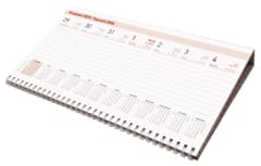 Kalendarz leżący, popularny zwłaszcza w biurze. Zawiera poręczne kalendarium w układzie tygodniowym z dużą powierzchnią do notowania. W dolnej części kalendarium skrócone kalendarium całego roku.W kalendarzu zaznaczone święta i daty imienin. Kalendarz posiada wygodną kartonową podstawkę. Istnieje możliwość założenia indywidualnej okładki.