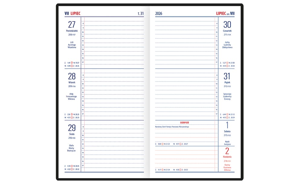 Kalendarz Tenoris na rok 2024 posiada kalendarium w ukladzie tygodniowym (tydzien na dwóch stronach) i wymiarach 102 x 193 mm .