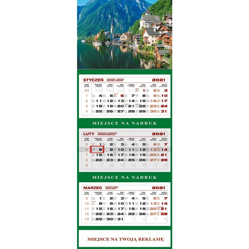 Kalendarz trójdzielny – nr kat. KS 055 BKalendarz wiszący ścienny z kalendarium w układzie trójdzielnym z ozdobną główka, wypukłą i lakierowaną. Kalendarz składany do formatu A4. Możliwość wykonania nadruku reklamowego pomiędzy kalendariami oraz na dole kalendarza. Wykonujemy również kalendarze z główką i pleckami wg indywidualnego projektu.