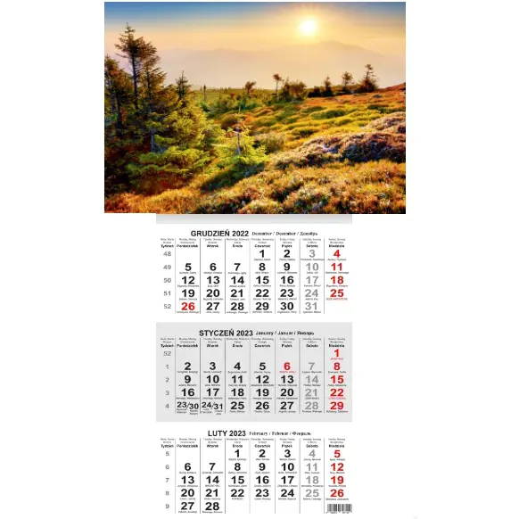 Kalendarz trójdzielny T1 BESKIDY Kalendarium z imionami i bieżącą numeracją tygodni, drukowane na papierze offsetowym 70g/m2, 10 różnorodnych zdjęć do wyboru.