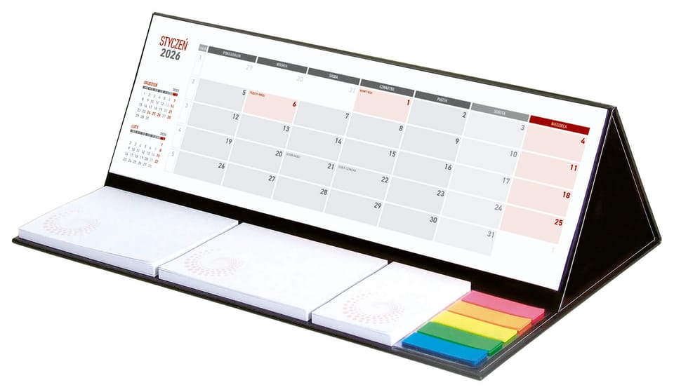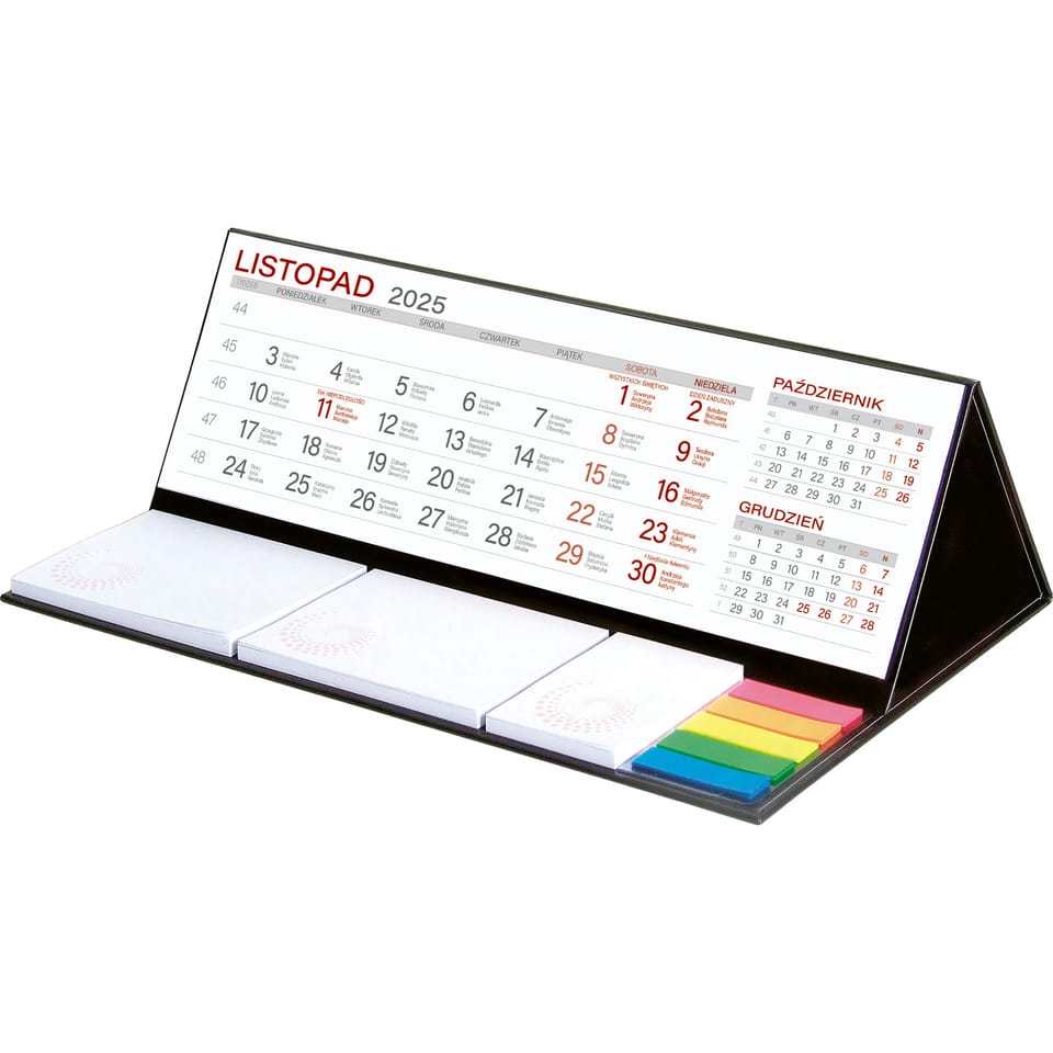 Kalendarz z notesem MAXI miesięczny – nr kat. KB 062 BWygodny kalendarz stojący na biurko z przejrzystym kalendarium w układzie trójdzielnym. Poręczne samoprzylepne karteczki do notowania. W kalendarzu zaznaczone święta. Na tylnej części podstawki kalendarza istnieje możliwość naniesienia reklamy na obszarze o wymiarach 305 x 100 mm w formie nadruku lub naklejki.