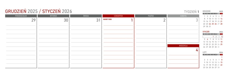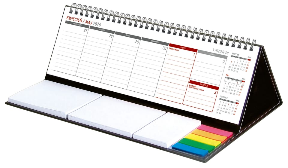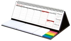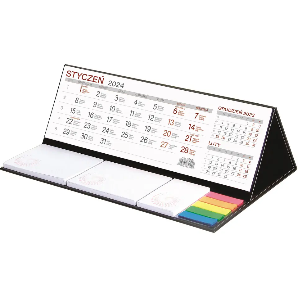 Wygodny kalendarz stojący na biurko z przejrzystym kalendarium w układzie tygodniowym z miejscem do notowania. Poręczne samoprzylepne karteczki. Kalendarium na spirali.W kalendarzu zaznaczone święta. Na tylnej części podstawki kalendarza istnieje możliwość naniesienia reklamy na obszarze o wymiarach 305 x 100 mm w formie nadruku lub naklejki.