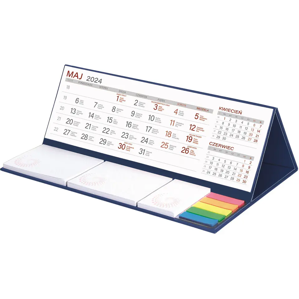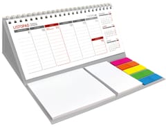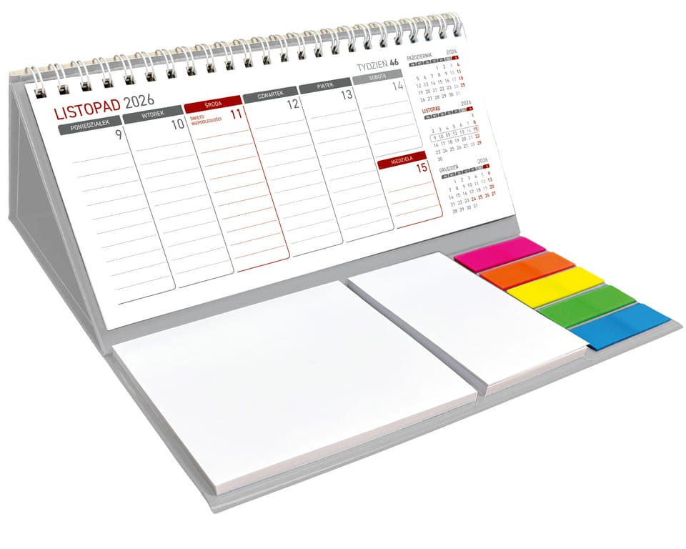 Praktyczny kalendarz stojący na biurko z przejrzystym kalendarium w układzie tygodniowym z miejscem do notowania. Poręczne samoprzylepne karteczki.