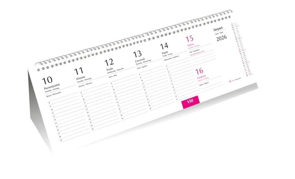 Terminarz posiada przejrzyste kalendarium , które umozliwia latwe planowanie na calym roku. Kazdy tydzien przedstawiony jest na jednej stronie, co ulatwia organizacje codziennych zadan .