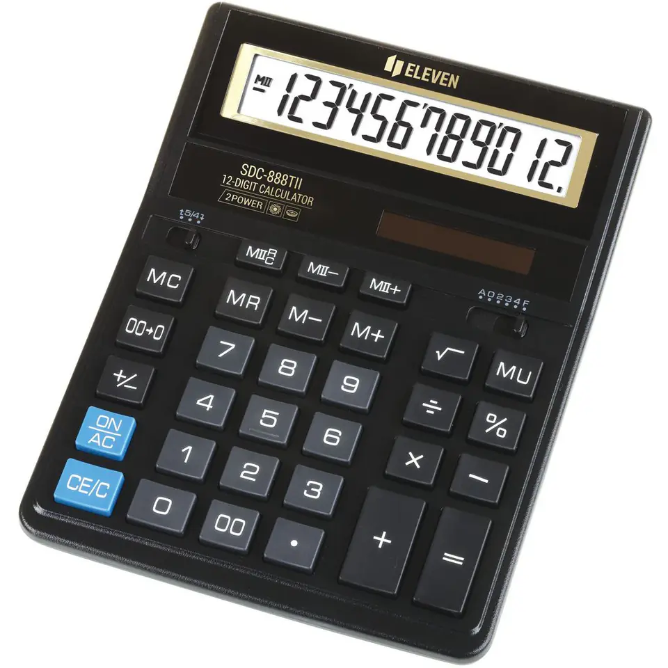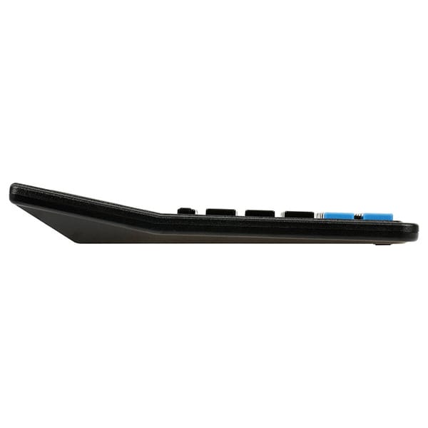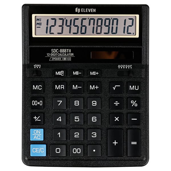 Kalkulator biurowy: - 12-pozycyjny wyświetlacz, 4 przyciski pamięci: MC, MR, M+, M-, Obliczanie marży MU, Pierwiastek kwadratowy √, Zmiana znaku +/-, Kasowanie ostatniej pozycji, Wybór dziesiętny, Procenty %, Zaokrąglanie wyników, Podwójne zero 00, - Podwójne zasilanie: bateria i bateria słoneczna