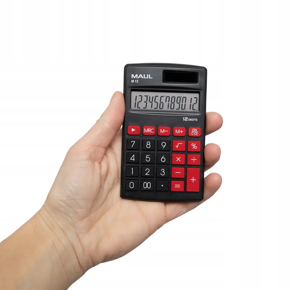 Kieszonkowy kalkulator MAUL M 12 w kolorze czarnym z duzym, 12-pozycyjnym wyświetlaczem LCD. Niezawodny, stylowy i dokladny. Wyjątkowo plaski: mieści sie w kazdej torbie, teczce, tornistrze czy plecaku. Sprawia, ze zycie staje sie kolorowe! Dostepny w 3 modnych wersjach kolorystycznych. Szybsze wyszukiwanie: przyciski funkcyjne i numeryczne w róznych kolorach. Kompaktowy rozmiar i zaokrąglone krawedzie sprawiają, ze dobrze lezy w dloni. Z antypoślizgowymi, gumowymi przyciskami. Energooszczedny, dzieki podwójnemu zasilaniu baterią i baterią sloneczna, z funkcją automatycznego wylączania. Wyposazony w 3 przyciski pamieci, obliczanie pierwiastków kwadratowych i procentów. Gwarancja: 5 lat. Wymiary: 11,5 x 6,9 x 1,0 cm. Zawiera jedną baterie (LR1130). Ekologiczne opakowanie z tektury, bez uzycia plastiku, z eurozawieszką.