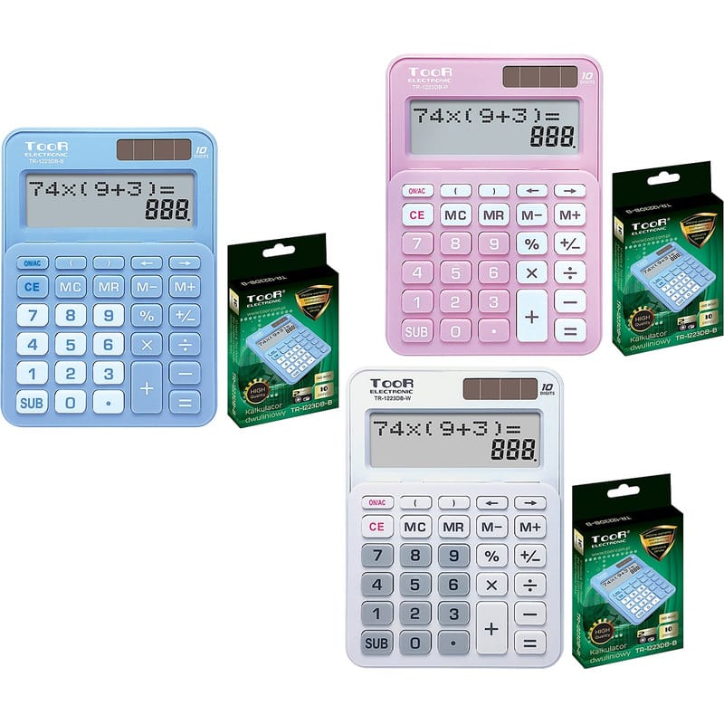 * dwuliniowy wyświetlacz* 10-pozycyjny* kasowanie ostatniej pozycji* klawisze przechodzenia pomiędzy cyframi* wykonywanie działań w nawiasach* obliczanie procentu* pamięć* klawisz zmiany znaku* zasilanie bateryjne i słoneczne* rozmiar: 148x105x20 mm* zgodny z wymaganiami UE* dożywotnia gwarancja* instrukcja obsługi* kolory: niebieski, różowy, biały