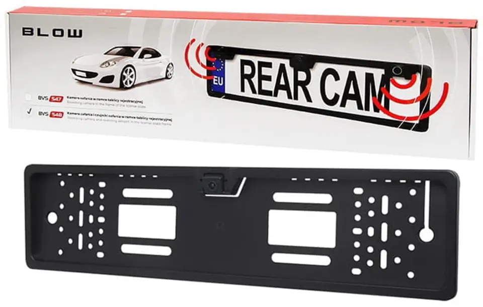 Przewodowa kamera cofania oraz dwa czujniki parkowania marki Blow zamocowane w ramce tablicy rejestracyjnej przeznaczone do zamontowania zarówno w samochodach osobowych jak i dostawczych. Zadaniem kamery jest przekazywanie aktualnego obrazu znajdującego się za pojazdem, co zdecydowanie ułatwi parkowanie i cofanie w miejscach z ograniczoną widocznością.