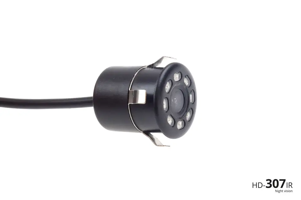 Kamera AMiO HD-307-IR z funkcją "Night vision". Wysoka rozdzielczość HD 720p . Kamera wyglądająca jak standardowy czujnik parkowania. Średnica montażowa ?18mm ,średnica zewnętrzna ?22mm. Doskonale wpasuje się w każdy pojazd, nie burząc linii stylistycznej . Dodatkowe diody IR zapewniają bardzo dobry widok obrazu otoczenia w miejscach słabo oświetlonych w nocy. W zestawie: - Kamera z doświetleniem IR (przewód ok 50cm) - przewód sygnałowy 6m - przewód zasilający 1m - otwornica 18mm Pełna specyfikacja: zasilanie 12V DC rozdzielczość HD 720p kąt widzenia 50° doświetlenie nocą diody IR (podczerwień) obraz rewers prąd pracy 50-200mA temperatura pracy -30°C - +70°C wymiary ?22 x 22mm średnica montażowa 18mm system NTSC