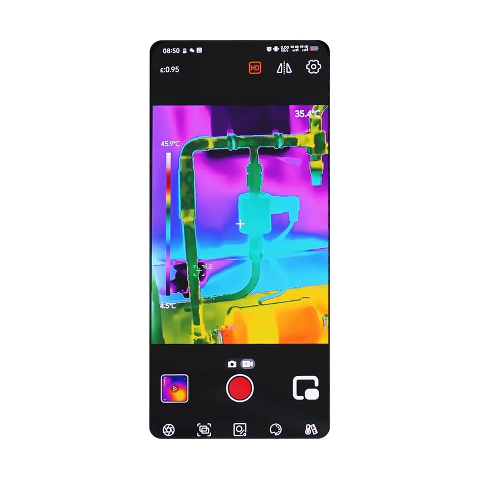 Zakres temperatury: -20°C ~ 550°CDokładność: ?2°C lub ?2% Rozdzielczość IR: 400 x 300 pxPalety kolorów: 7Płynność obrazu: 25 HzPalety kolorów: 7Pole widzenia: 29° x 21,5°Rozmiar piksela: 12 ?mNETD: Złącze: USB-CWymagany system operacyjny: Android 6 lub wyższyWymiary: 58 x 27 x 28,6 mmWaga: 46 gCertyfikacja: CE, UKCA, FCC, RoHS