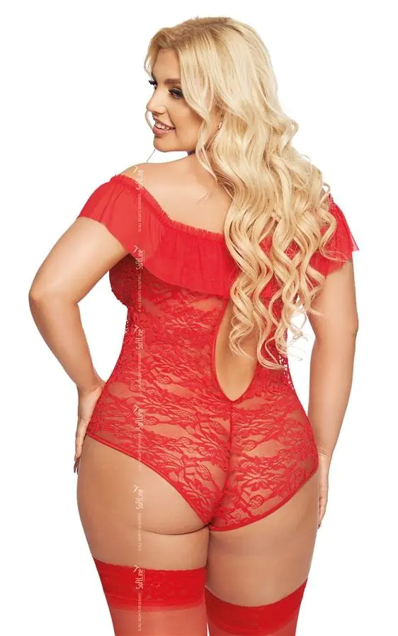 Frywolne koronkowe body z intrygującą falbaną w kolorze czerwonym.