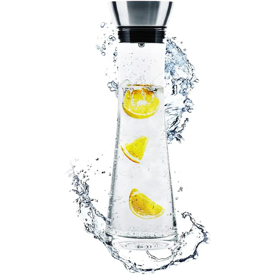 Karafka szklana 1 L z ręcznie wykonanego szkła. Wyposażona w wysokiej jakości pokrywkę ze stali nierdzewnej.Zintegrowane sitko, wbudowane w nakrętkę, ułatwia nalewanie wody i zatrzymuje wewnątrz karafki plasterki cytryny, kostki lodu, listki mięty itp.Wygodna i poręczna.Nadaje się również do gazowanych napojów. Łatwa do napełnienia.Można myć w zmywarce.Cechy produktu:· Ręcznie wykonane szkło· Pokrywka ze stali nierdzewnej w kolorze srebrnym· Zintegrowane sitko zatrzymuje owoce, kostki lodu w karafce· Możliwość mycia w zmywarce· Pojemność: 1 L· Wysokość: 33, 5 cm· Średnica: 10,5 cm· Zapakowana w pudełko