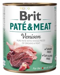 Bez zbóż. Bez dodatku konserwantów. 70% dziczyzna i kurczak. Brit Pate&Meat Venison zapewnia kompletne i zbilansowane żywienie. Karmę należy podawać w temperaturze pokojowej. Dawkowanie karmy może różnić się w zależności od aktywności psa i środowiska, w którym żyje. Podając puszkę celem urozmaicenia i wzbogacenia smaku posiłków, należy odpowiednio pomniejszyć dzienną porcję karmy podstawowej. Należy zapewnić psu dostęp do świeżej wody.Przechowywać w suchym i chłodnym miejscu. Po otwarciu przechowywać w lodówce