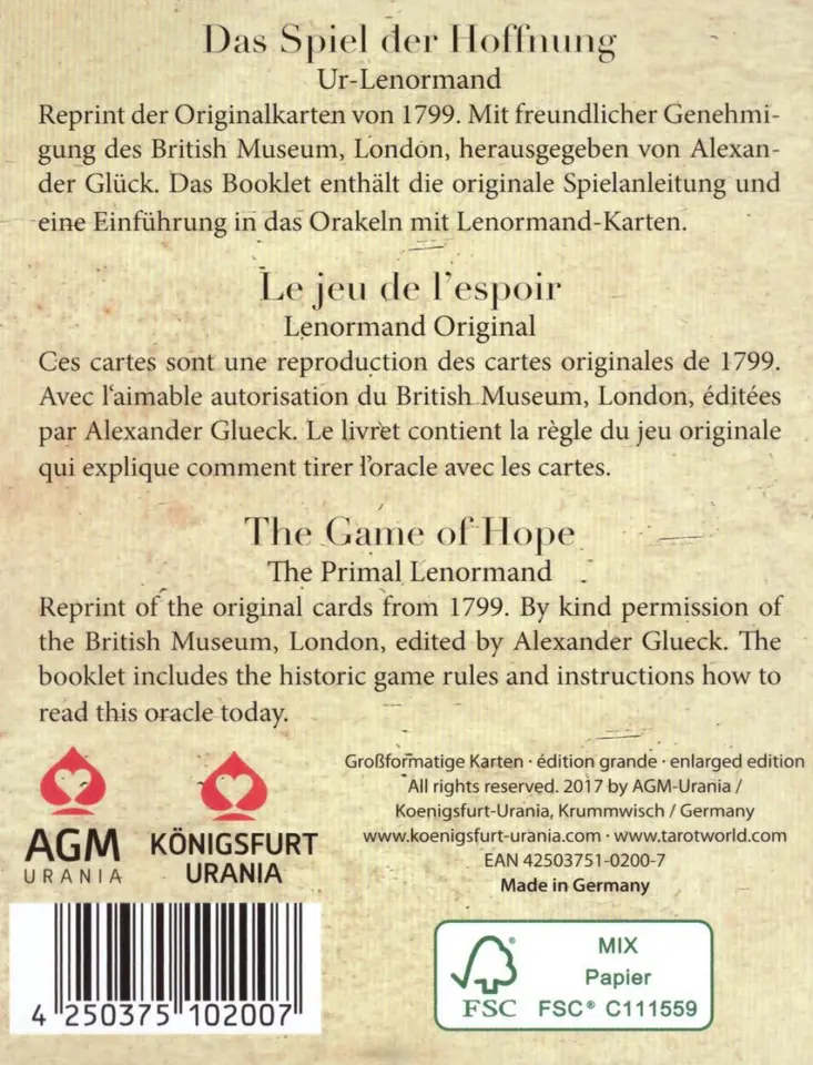 Reprint oryginalnych kart z 1799 roku. Zawiera instrukcję i zasady współczesnego odczytywania kart. Instrukcja w języku angielskim.