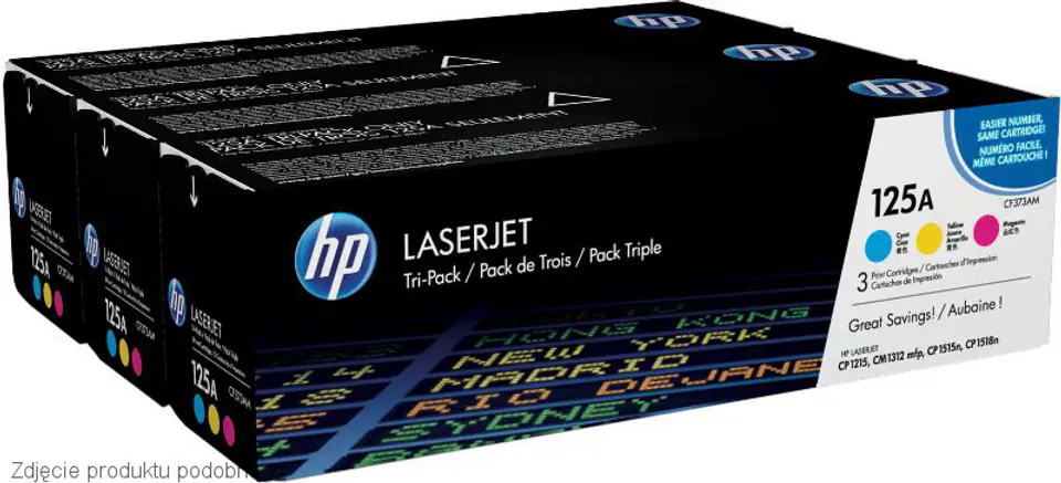 Zestaw trzech tonerów w kolorach zółtym, cyjan i magenta, każdy o wydajności do 1400 stron przy pokryciu 5%. Dedykowane dla drukarek marki HP.