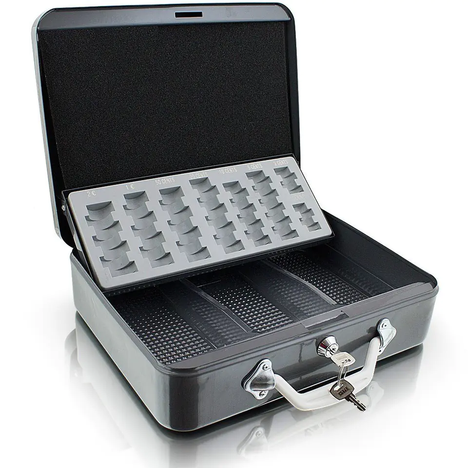 Fabrycznie nowa, wysokiej jakości metalowa kasetka do przechowywania lub transportu monet, banknotów lub innych wartościowych przedmiotów.Solidna i poręczna walizka z metalu wyposażona w sortownik do monet jest idealnym miejscem do przechowywania banknotów oraz monet. Na dole jest sporo miejsca na przykład na rachunki, paragony, monety, banknoty i inne przydatne przedmioty. Dla bezpieczeństwa kasetka jest zamykana na klucz. Ergonomiczny uchwyt sprawia że transport staje się dziecinnie prosty.