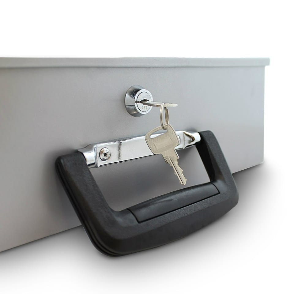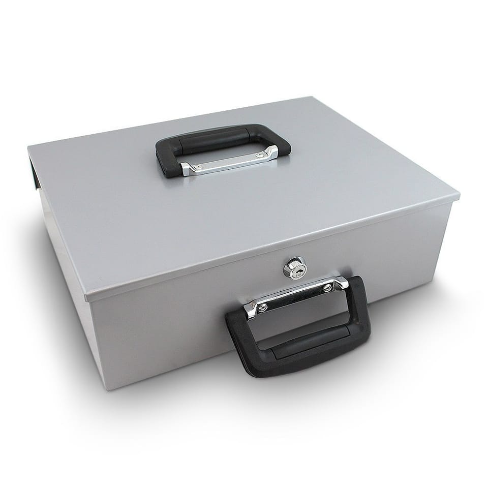 SOLIDNA KASETKA DO TRANSPORTU I PRZECHOWYWANIA GOTÓWKI 35 CMUWAGA - do kasetki pasuje tylko bilon Euro! Fabrycznie nowa, wysokiej jakości metalowa kasetka do przechowywania lub transportu monet, banknotów lub innych wartościowych przedmiotów.Solidna i poręczna walizka z metalu wyposażona w sortownik do monet jest idealnym miejscem do przechowywania banknotów oraz monet. Na dole jest sporo miejsca na przykład na rachunki, paragony, monety, banknoty i inne przydatne przedmioty. Dla bezpieczeństwa kasetka jest zamykana na klucz. Ergonomiczny uchwyt sprawia że transport staje się dziecinnie prosty.WYPOSAŻENIE: - 4 przedziałki na banknoty,- wyjmowana tacka na monety,- wkładka z pianki w pokrywie do mocowaniamonety w czasie transportu,- 2 Praktyczne uchwyty do transportu,- dwa klucze w zestawieSKŁAD ZESTAWU:- 1x skrzynka na pieniądze 35cm,- 2x klucze DANE TECHNICZNE: Wymiary: 360mm x 290mm x 120mm (Szer / Gł / Wys),Kolor: Szary,Waga: 4,6kg
