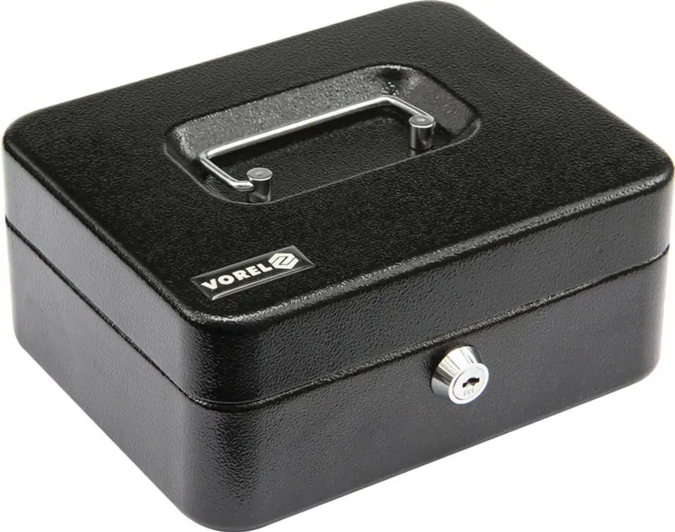 Przenośna kaseta na pieniądze o wymiarze 200x160x90mm. Wykonana z blachy stalowej o grubości 0,7mm, pomalowana w kolorze czarnym. Zamykana na zamek. W zestawie znajdują sie 2 klucze. Wewnątrz wyciągana wkładka na monety wykonana z tworzywa sztucznego.
