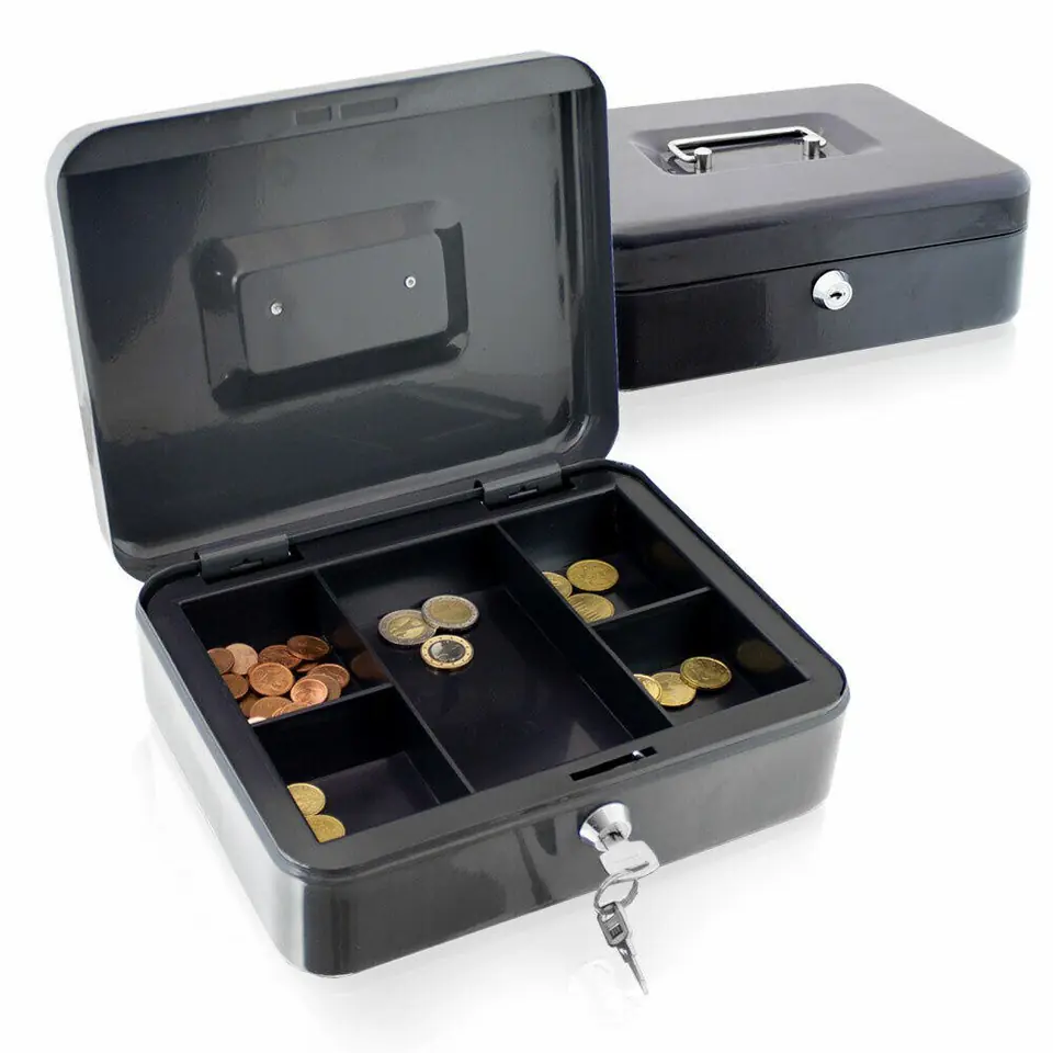 -Kasa wykonana ze stali 0,8mm -Wyjmowana tacka na monety z 5 przegródkami -Uchwyt na pokrywie - w tym 2 kluczeW Zestawie: