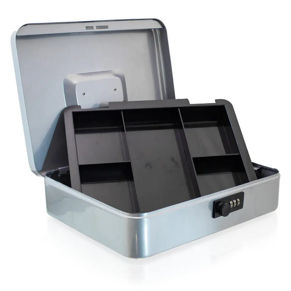 Szara kasetka na gotówkę to dobre rozwiązanie podczas transportu pieniędzy oraz prac sezonowych np. jako kasa czy portfel. Wyposażona w mocny zamek szyfrowy, który skutecznie chroni zawartość przed próbą dostępu przez osoby niepowołane. Posiada dodatkową wkładkę na bilon. Sejf będzie pasował do każdego pomieszczenia, a jego rogi są bezpiecznie zaokrąglone. Uchwyt pozwoli na szybki transport, który chowa się w głąb górnej części wieczka. Skrytka jest lakierowana proszkowo,a jej wkład wykonany z mocnego plastiku.