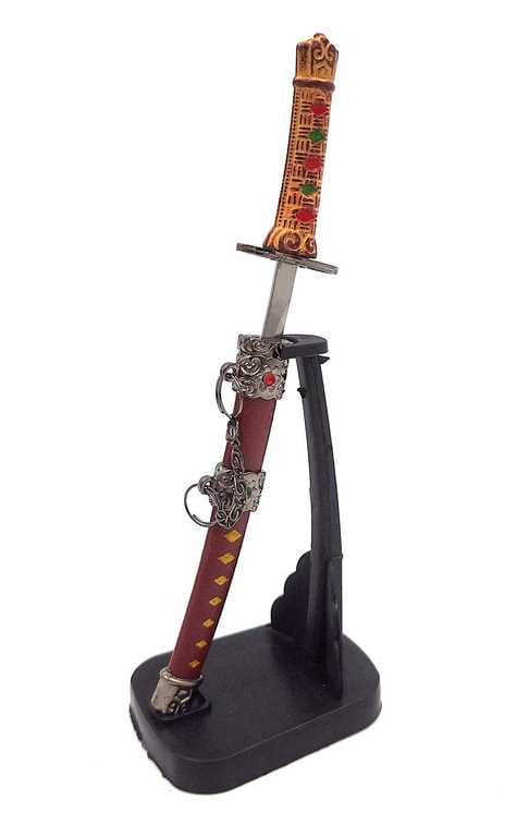 Katana - nóż do papieru SW-199 Nóż do papieru w kształcie katany to oryginalny dodatek do biura. Świetnie sprawdzi się jako upominek dla miłośnika kultury japońskiej lub kolekcjonera broni. Wysokość: 18cm. Informacje o produkcie: Nóż do papieru w kształcie katany Wysokość: 18 cm Waga: 0,05 kg Dekoracyjna pochwa na katanę w komplecie To nie jest broń – katana ma stępione ostrze
