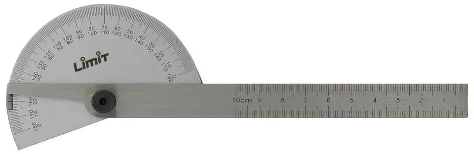 Z blachy stalowej. Podziałka 0-180° w obu kierunkach. W wersji z tarczą półokrągłą lub prostokątną. Ze śrubą ustalającą.