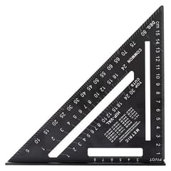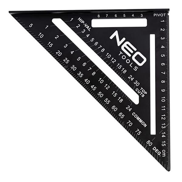 Kątownik 15 cm, wykonany z aluminium, wymiary 18,3x18,3x2,2 cm, do szybkiego wyznaczania kątów 45 i 90°, podziałka w cm i calach, specjalistyczne podziałki kątowe przeznaczone do pomiarów wykonywanych przy pracach dekarskich i ciesielskich
