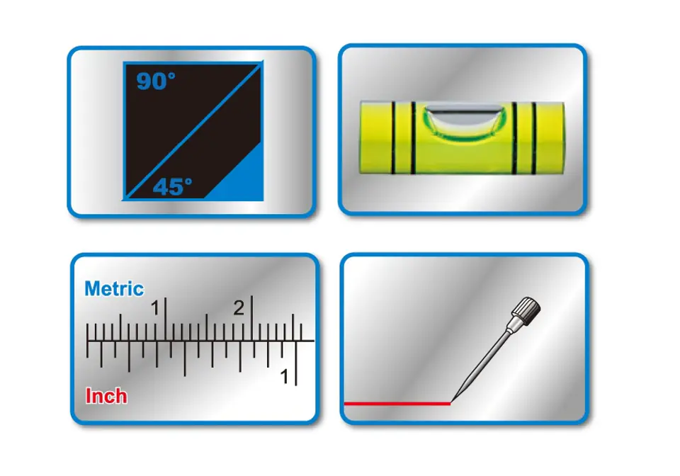 Kątownik wielofunkcyjny, metryczny i calowy oznaczone na liniale