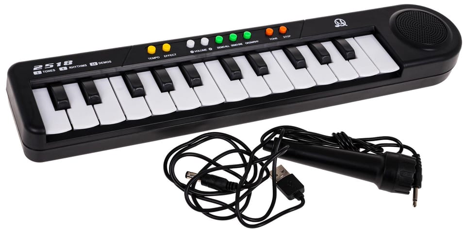 | Keyboard, zabawka muzyczna dla dzieci powyżej 3-go roku życia. Keyboard to wielofunkcyjną zabawką edukacyjną, która rozwija jednocześnie wyobraźnię, umiejętności muzyczne, poczucie rytmu, zmysł słuchu, a ponadto pozwala rozbudzać pasję muzyczną naszych małych wirtuozów. Keyboard to propozycja dla wszystkich dzieci ciekawych świata muzyki i dźwięków.KEYBOARD posiada: - przycisk zasilania on/off, - klawiaturę muzyczną (15 klawiszy białych +105 klawiszy czarnych), - 3 tony,- 8 rytmów,- 24 podkłady demo,- przyciski regulacji głośności, - przyciski regulacji tempa, - wyjście na mikrofon, - głośnik, - mikrofon, - zasilacz.ZASILANIE INSTRUMENTU (wymiennie):1. przez sieć - zasilacz USB dołączony do keyboardu, 2. baterie typu AA (3 x AA 1,5V - brak w zestawie). | |