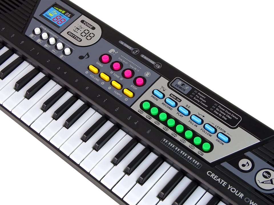 Ten keyboard posiada aż 49 klawiszy, co pozwala na łatwe i naturalne granie. Wbudowany mikrofon pozwala na śpiewanie ulubionych piosenek, co z pewnością zainteresuje dzieci, które chcą eksperymentować z wokalem. Przyciski są łatwe w obsłudze, a ergonomiczny design sprawia, iż produkt jest bardzo wygodny w użytkowaniu. Lekka konstrukcja umożliwia przenoszenie zabawki i stawianie na stoliku lub biurku, dzięki czemu dziecko może organizować swe pokazy w każdym zakątku mieszkania. Zewnętrzne gniazdo wejściowe pozwala na słuchanie ulubionych piosenek.