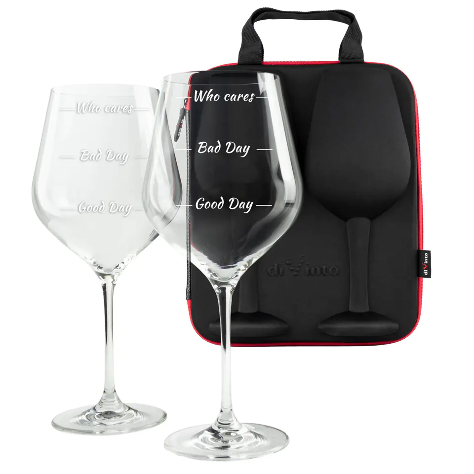 Oryginalny zestaw do wina Etui z kieliszkami diVinto - Who Cares to zestaw dwóch kieliszków, które pomieszczą całe wino, zapakowanych w eleganckie etui.Same kieliszki wyróżniają się nie tylko rozmiarem i kolorem, ale też dowcipnym nadrukiem, idealnym na każdy nastrój.To prezent z przymrużeniem oka, który pokazuje, jak dobrze kogoś rozumiesz. Etui, które zabierzesz wszędzie Cieszenie się życiem jest łatwe, jeśli robi się to przy dobrym winie, a jeszcze łatwiejsze, kiedy wino pije się z wyjątkowych kieliszków w dobrym towarzystwie.Kieliszki Who cares możesz zabrać ze sobą dosłownie wszędzie dzięki wytrzymałemu etui, którego zadaniem jest chronić je przed potłuczeniem i umożliwić ich bezpieczne przenoszenie.Mocny, usztywniany materiał, praktyczny uchwyt i dbałość o detale sprawiają, że taki prezent zapadnie w pamięć obdarowanej osobie. Trzy poziomy napełnienia Na kieliszkach zaznaczone są trzy poziomy napełnienia, bo życie to przeplatanka dni, które warto świętować, ale i takich, o których wolelibyśmy zapomnieć.Dla tych pierwszych przewidziany jest poziom Good Day (Dobry Dzień), a Bad Day (Zły Dzień) dla drugich. Uwaga, startując z tego poziomu, prędzej czy później dojdziesz do Good Day. :)Gdy jest Ci wszystko jedno i chcesz po prostu się zrelaksować, użyj poziomu Who cares (Kto by się przejmował) - przynajmniej nie będziesz martwić się o dolewki. Radością trzeba się dzielić Jedyną wadą dobrego wina jest konieczność jego ciągłego dolewania, bo szybko znika z kieliszków. Gigantyczne kieliszki diVinto skutecznie (i z humorem) rozwiązują problem wiecznie pustego szkła, bo mogą pomieścić nawet całą butelkę tego pysznego trunku. Kieliszki są dwa, bo radością trzeba się dzielić, a motyw poziomów wina też pięknie zagra przy dwóch osobach; bo jeśli u mnie jest "bad day", a u Ciebie "good day" to razem mamy "the day wasn’t so bad" – we dwoje zawsze raźniej! Dla kogo Etui z kieliszkami diVinto to ciekawy prezent na ślub, np. zamiast kwiatów, bo to podarunek trwały i praktyczny. Pomoże Młodej Parze z humorem i optymizmem przetrwać gorsze chwile, a także ułatwi świętowanie tych najlepszych.Gadżet doskonale sprawdzi się na rocznicę lub Walentynki, bo warto stworzyć romantyczną oprawę do celebracji wspólnie spędzonych chwil, a dzięki przenośnemu etui z kieliszkami można ją mieć wszędzie.Babski wieczór z przyjaciółką to jeszcze jedna okazja, która aż się prosi o użycie gigantycznych kieliszków. Jeśli w naszym kręgu jest para miłośników wina, którą lubimy, to Etui z kieliszkami diVinto będzie dla nich idealną niespodzianką. Poziomy napełnienia zaznaczone na szkle nadadzą inny wymiar ich wspólnym chwilom, okraszonym kroplą ulubionego trunku.