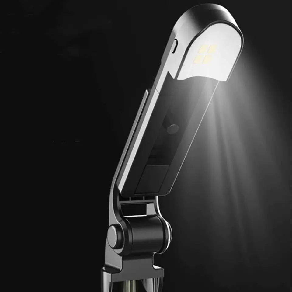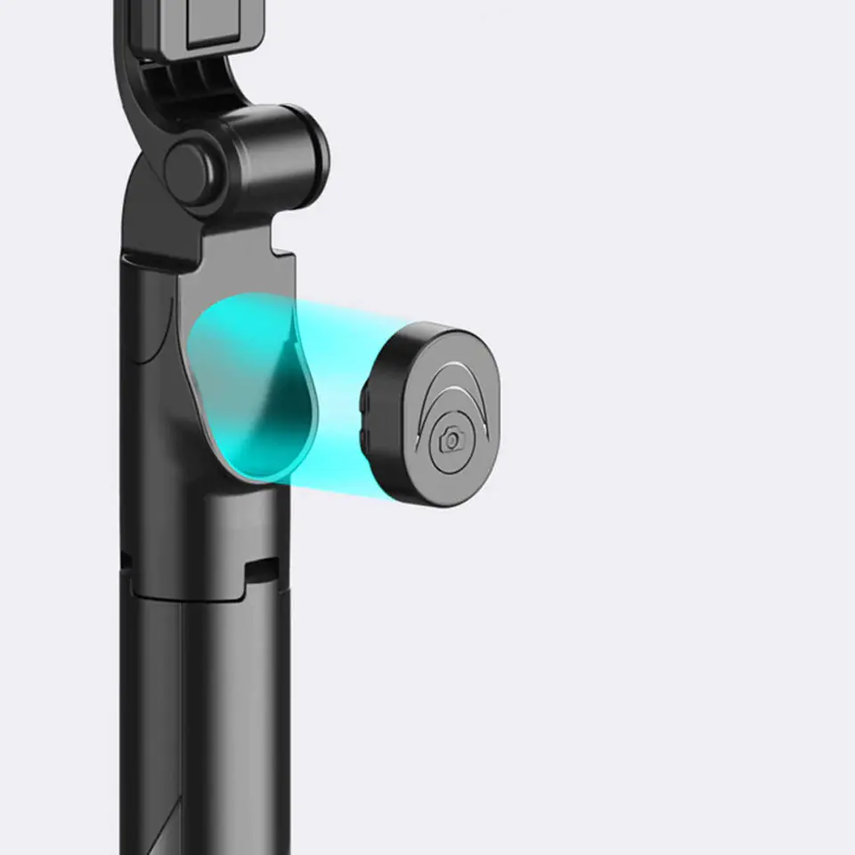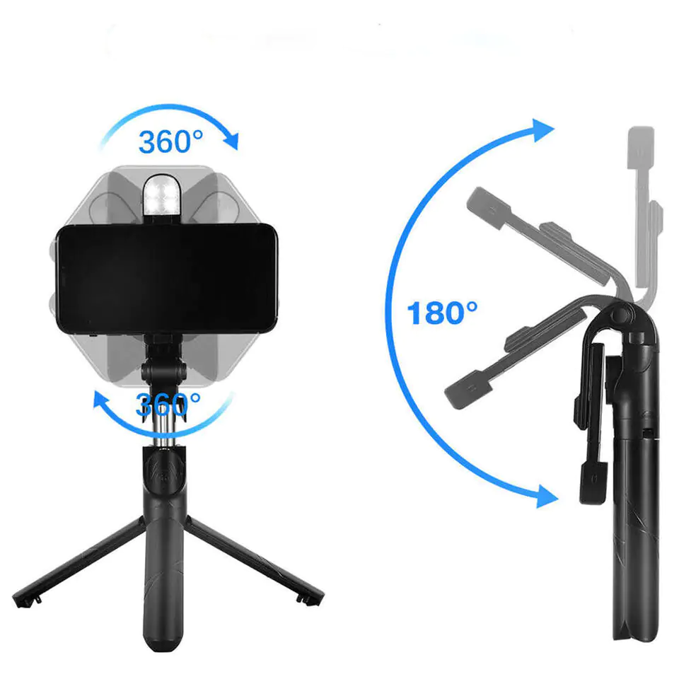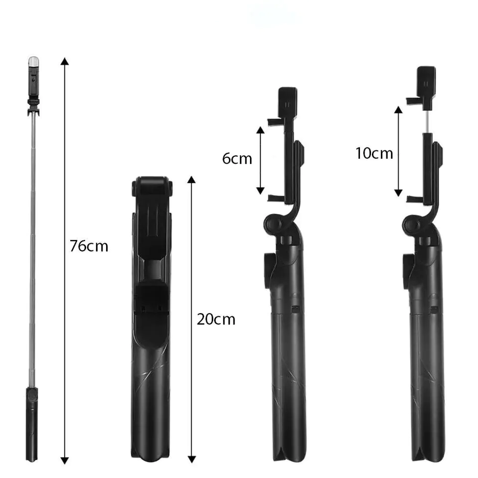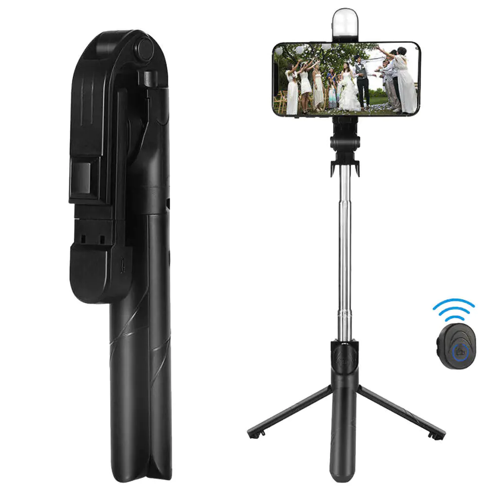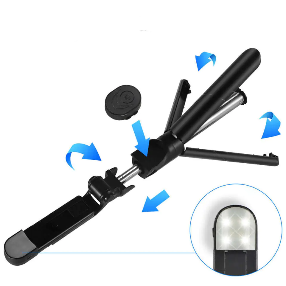 Selfie Stick z lampą LED posiada 3 nóżki, które po rozłożeniu tworzą stabilny statyw.