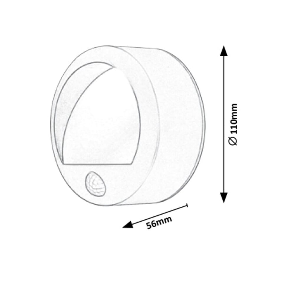 Specyfikacja- Kategoria produktu: lampa ogrodowa- Typ: zewnętrzne lampy ścienne- Styl: minimalistyczny- Pomieszczenie: ściana zewnętrzna- Temperatura barwowa: ciepła biel- Strumień świetlny źródła światła: 50lm- Moc źródła światła: 1,5W- Technologia LED: tak- Stopień ochrony: IP44- Kolor lampy: czarny- Dane techniczne czujnika: 2-8m, 90°- Materiał lampy: tworzywo sztuczne- Kolor klosza: biały- Materiał klosza: tworzywo sztuczne- Żywotność źródła światła: 30000 godzin- Stosowane napięcie: DC 4.5V- Odległość od ściany: 56.0 mm- Średnica: 110.0 mm- Waga brutto: 0.22 kg- Barwa światła: 3000 K- Zasilanie: 3x bateria AA (brak w zestawie)- Rodzaj czujnika: czujnik ruchu- Klasa ochronności: III