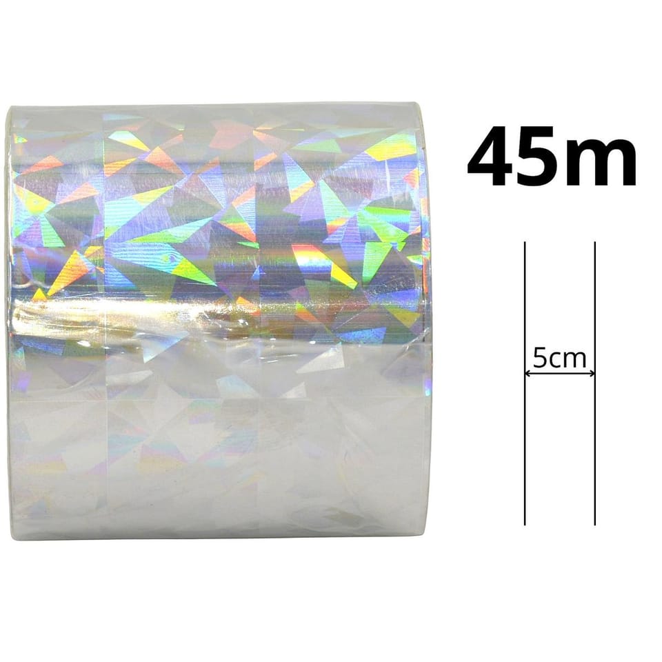 Taśma do odstraszania ptaków marki Kinzo odstraszy ptaki i inne szkodniki z Twojego ogrodu. Holograficzny wzór odbija światło, a gdy wieje wiatr, wydaje delikatny dźwięk, dzięki czemu skutecznie płoszy ptaki. Można go również używać do ochrony ryb w stawie. Opaskę można łatwo przyciąć do odpowiedniego rozmiaru.Cechy produktu:· Kolor: srebrny· Wykonana z tworzywa sztucznego· Długość: 45 m· Szerokość: 5 cm