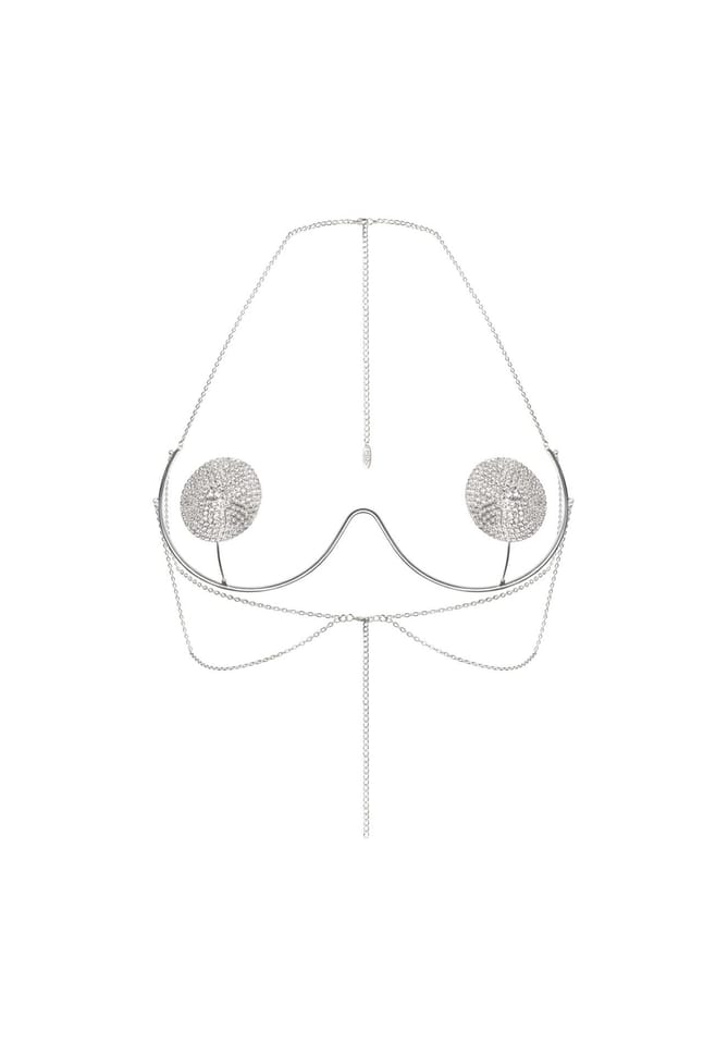 Biżuteryjny biustonosz z lekkimi łańcuszkami i połyskującymi kryształkami.Otwarta forma eksponuje biust, a efektowne nasutniki stanowią dominującą ozdobę.Łańcuszki umożliwiają wygodną regulację i dopasowanie.Cechy produktu:– Biżuteryjny design – Nasutniki pokryte kryształkami – Odpowiednio wyprofilowany kształt – Lekkie, drobne łańcuszki – Dwa wygodne zapięcia – Zaprojektowano w EU – Wykonany z: 40% stal, 40% żelazo, 10% miedź, 10% kryształki Produkt nieodpowiedni dla dzieci poniżej 3 lat — ryzyko zadławienia z powodu małych części.