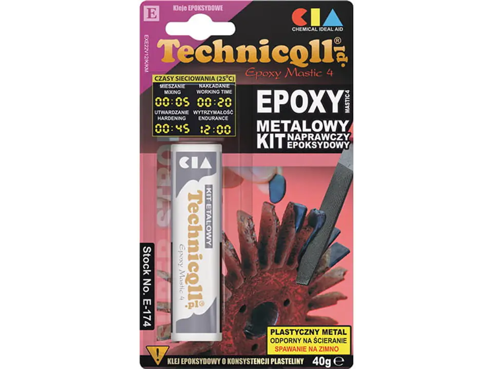 Epoksydowy klej do metalu o konsystencji plasteliny, tzw. plastyczny metal do szybkich napraw maszyn i urządzeń. Łączy, uszczelnia i uzupełnia ubytki we wszystkich metalach i ich stopach (aluminium, stal, żeliwo, mosiądz, brąz, itd.)