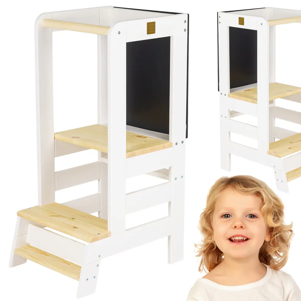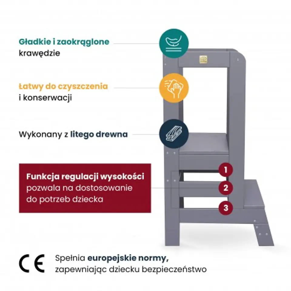 Bezpieczeństwo: wykonany z drewna sosnowego, Kitchen Helper jest stabilny i bezpieczny dla dziecka. Posiada certyfikat CE, co gwarantuje zgodność z europejskimi normami bezpieczeństwa.