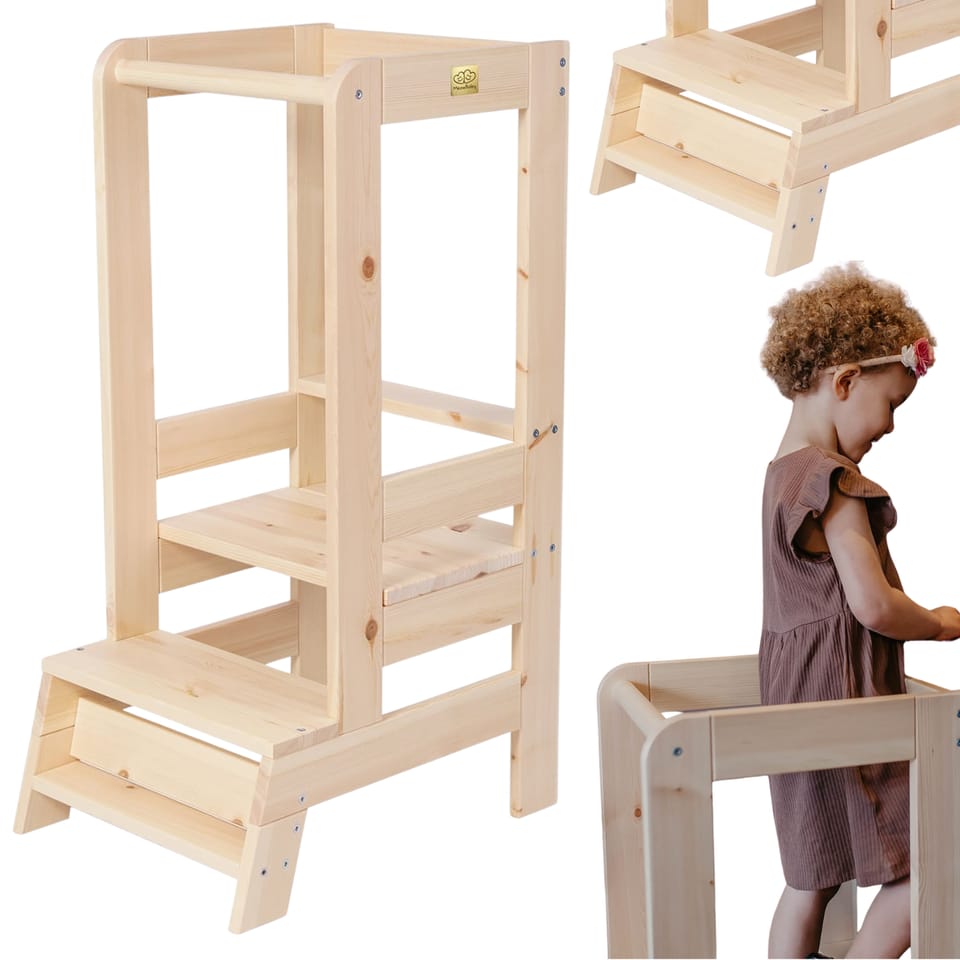 Specyfikacja:- materiał: drewno sosnowe- możliwość regulacji wysokości podestu w 3 wariantach ( 20cm - 33cm - 46cm liczone od podłogi )- regulacja jego wysokości nie wymaga użycia sprzętu ani siły - wystarczy przełożyć podest na wybraną listwę- produkt bezpieczny dla dziecka - posiada certyfikat CE- rekomendowany wiek dziecka 2+