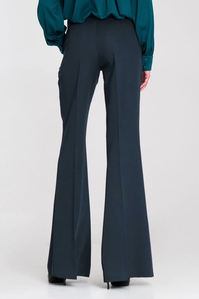 Krój fit, dopasowane. Średni stan. Nogawka mocno rozszerzająca się od kolana ku dołowi. Zaprasowane kanty z przodu i z tyłu. Zapięcie na suwak i 1 guzik. Klasyczna kieszeń z przodu. Skład: 75% poliester, 23% wiskoza, 2% elastan Modelka na zdjęciu ma 176 cm wzrostu i ma sobie rozmiar 36.