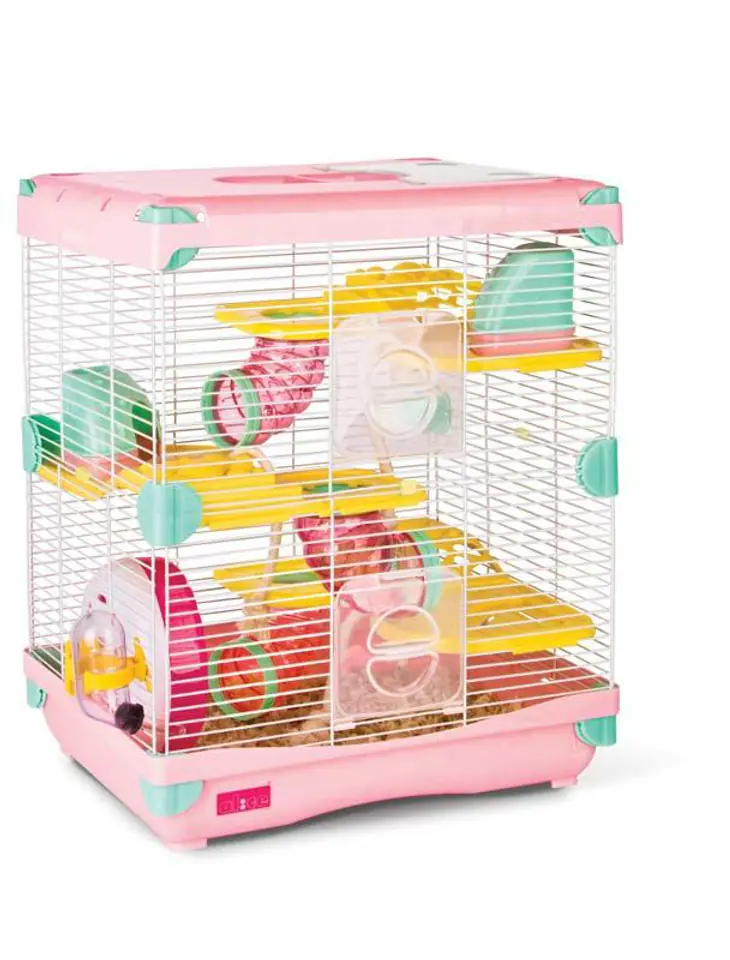 Klatka GREMI Adventure land rozmiar L dla chomika Gremi Adventure Land składa się z klatki drucianej i plastikowej górnej pokrywy oraz podstawy. Dwupiętrowa, wyposażona w kołowrotek, 3 tunele, 3 półki, 3 linki, 2 domki, miseczkę i poidełko, klatka jest bardzo atrakcyjna dla chomików, które potrzebują dużo ruchu. Zwierzęta mają w niej bardzo dużo przestrzeni i elementów, które umożliwiają swobodną zabawę. Dzięki zastosowaniu specjalnych plastikowych zacisków do łączenia ścianek, montaż klatki jest bezproblemowy. Można ją otwierać zarówno od góry, jak i z boku, gdzie znajdują się plastikowe drzwiczki. Dostępna w trzech różnych kolorach. plastikowa pokrywa i podstawa prosty sposób montażu wygodna w użytkowaniu i łatwa w utrzymaniu czystości przestronna i bogato wyposażona Wymiary: 36 x 27 x 43 cm Kolor: różowy