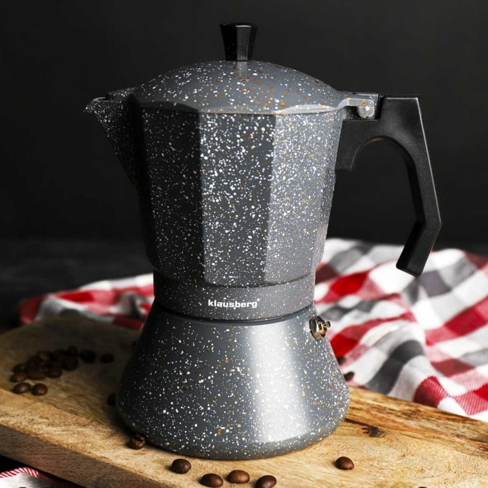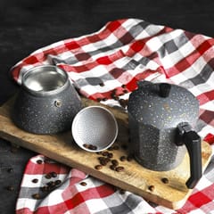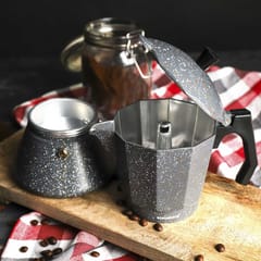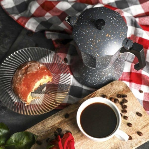 Gustowna i tradycyjna kawiarka do zaparzania kawy typu włoskiego. Doskonale sprawdzi się do parzenia zarówno mocnej małej kawki, jak i klasycznej kawy. Produkt został wykonany z wysokiej jakości grubego aluminium, które umożliwia równomierne i szybkie rozprowadzenie ciepła w naczyniu, co zapewni przygotowanie napoju w 5 minut. Kawiarka pokryta powłoką marmurkową. W dotyku przypomina kamień.